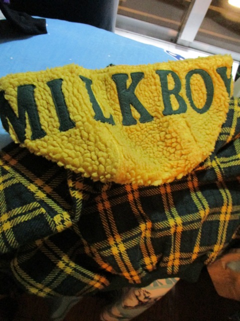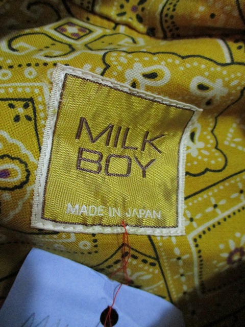 ボア地のフードには「MILK BOY」の文字パッチ付き