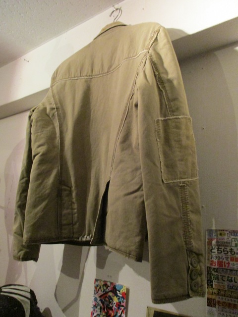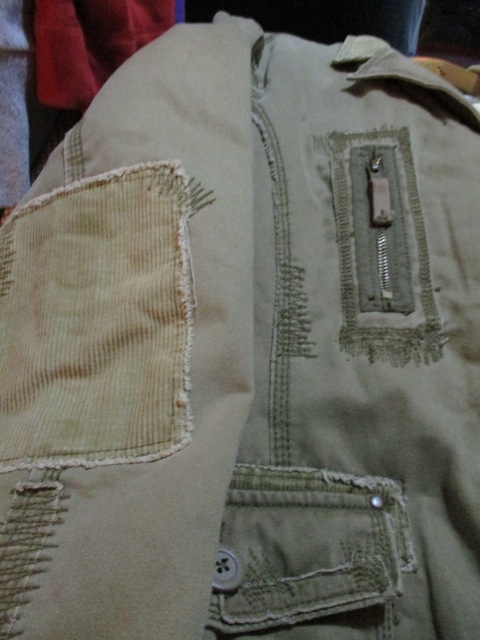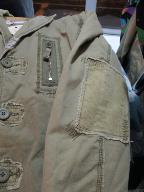ボタン部分や肘などにパッチやステッチなどダメージ加工がユニークな一着