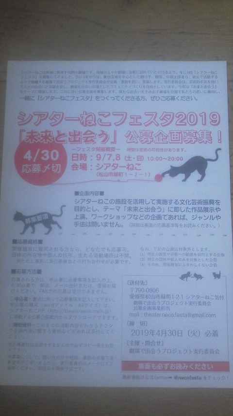 9月に開催される「シアターねこフェスタ 2019」の公募企画募集してるようです