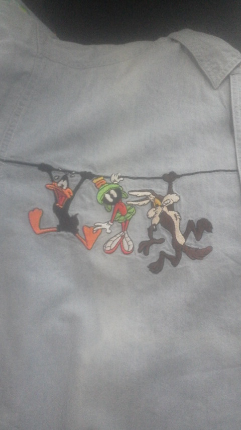 胸元にロープにぶらさがったルーニー・テューンズの人気キャラの刺繍