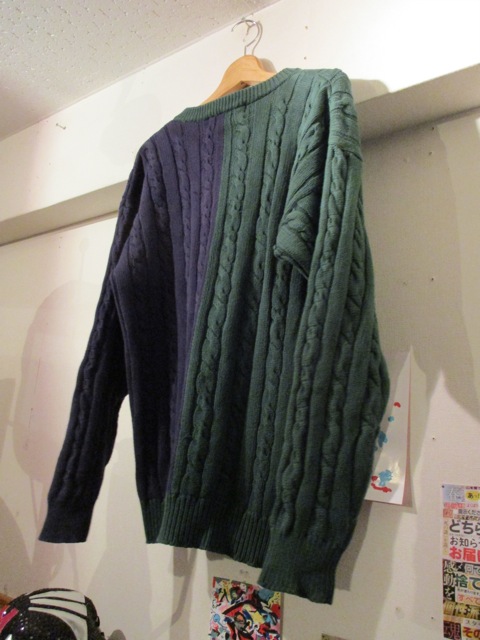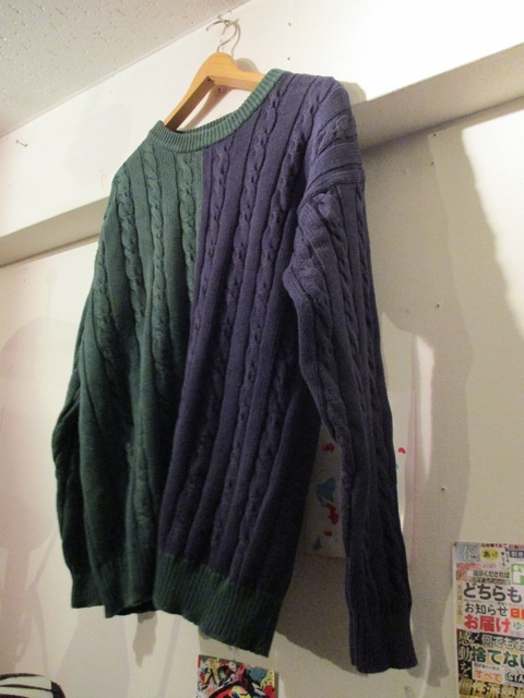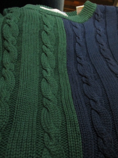 左右で緑×紺に分かれたユニークなツートーンニット