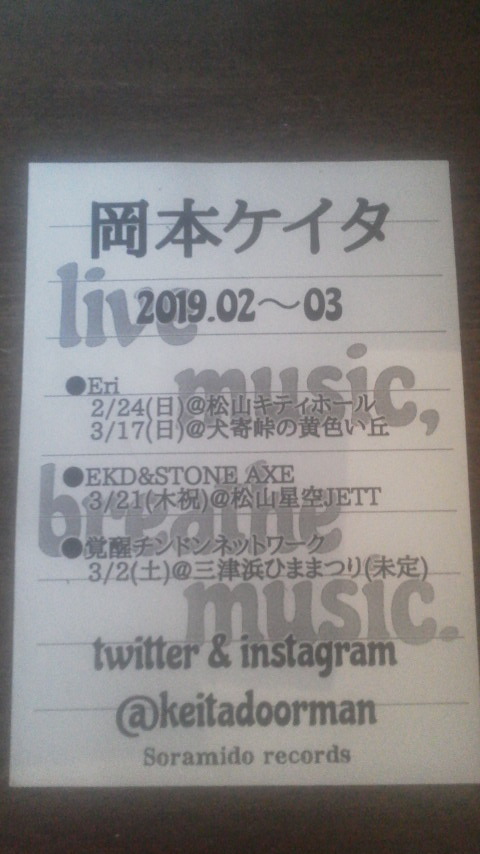 松山を拠点に「EKD&STONE AXE」「覚醒チンドンネットワーク」のメンバー、「Eri」のサポートなど様々な音楽活動を展開する Soramido records の岡本ケイタ氏のライブスケジュール貼ってます