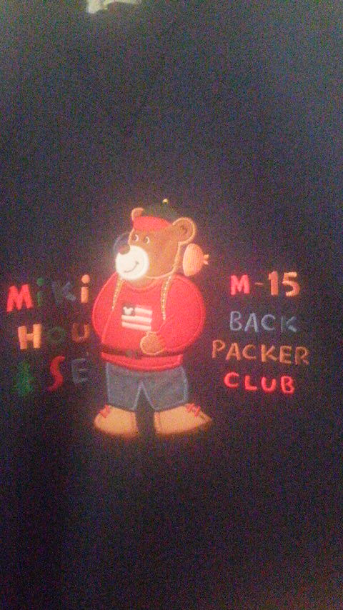 コチラは可愛らしいバックパッカーなクマと、ブランド名など文字が刺繍された一枚