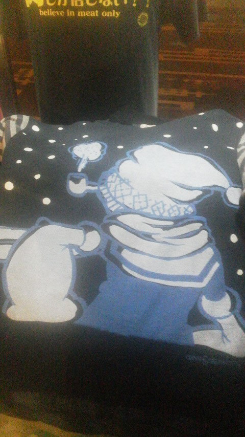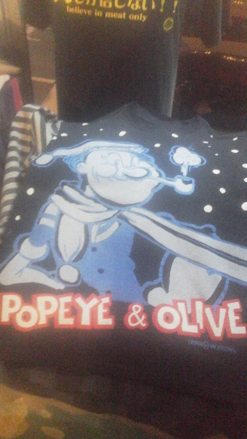 前面に雪が舞う中マフラーを巻いたポパイ、背面には後ろ姿のポパイがプリントされたPOPな一枚