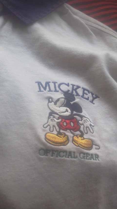 前面左胸にミッキーの刺繍、背面に「MICKEY」の文字パッチの付いたラガーシャツ