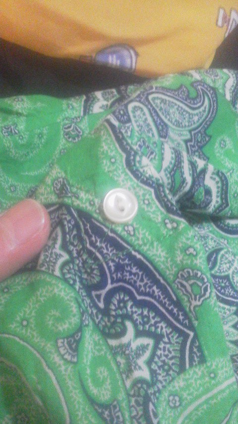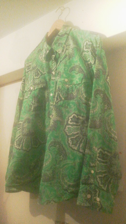 鮮やかな緑色に紺と白で入ったペイズリー柄が目をひく一枚