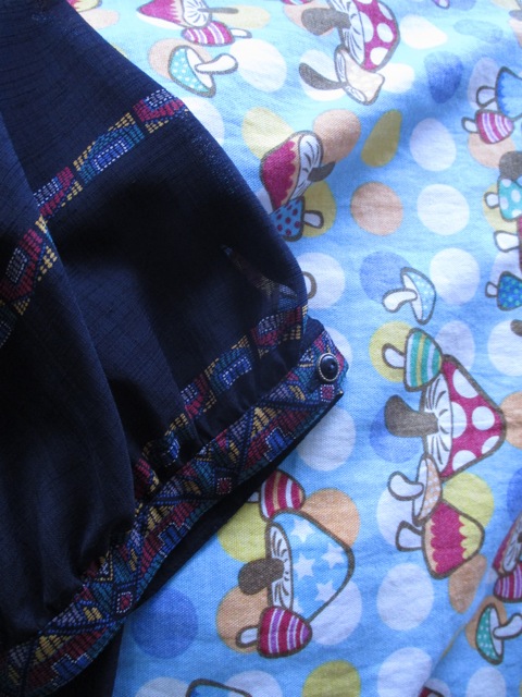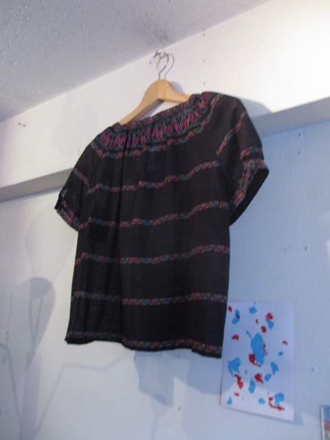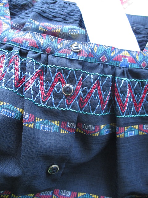 黒地にカラフルな刺繍とボーダー状にカラフルな柄が印象的な一枚