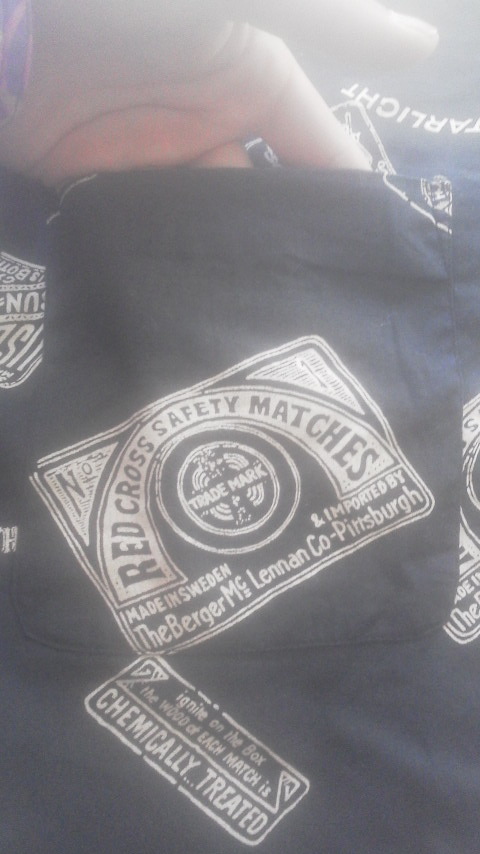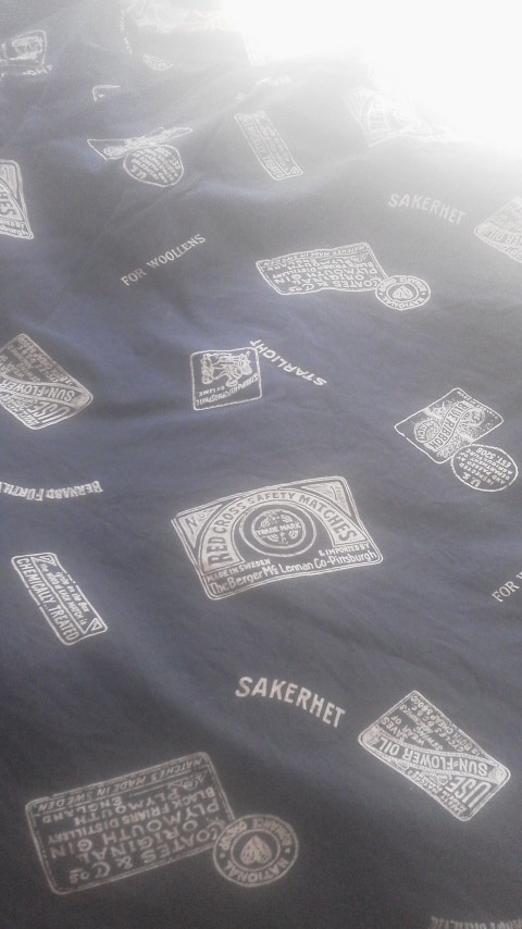 外国のマッチやオイルのパッケージなどがプリントされた柄