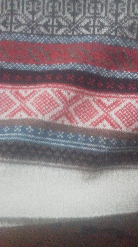 下側には青や赤、グレーなどの色も加えたボーダー状の幾何学柄の組み合わせ