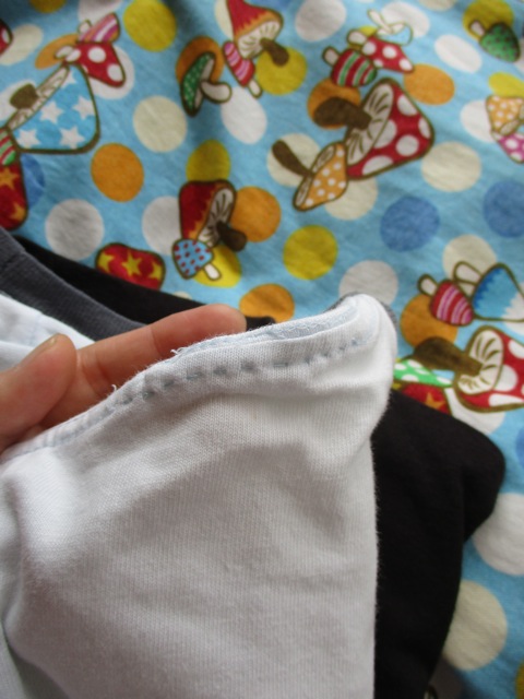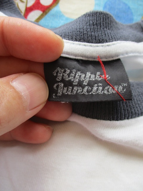 少し青みがかったボディにネイビーで入ったプリントのリンガーT