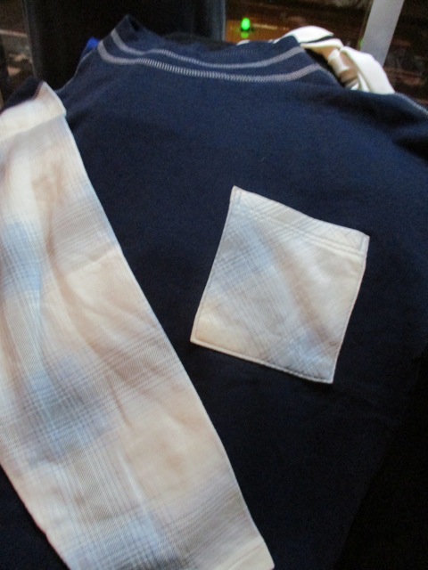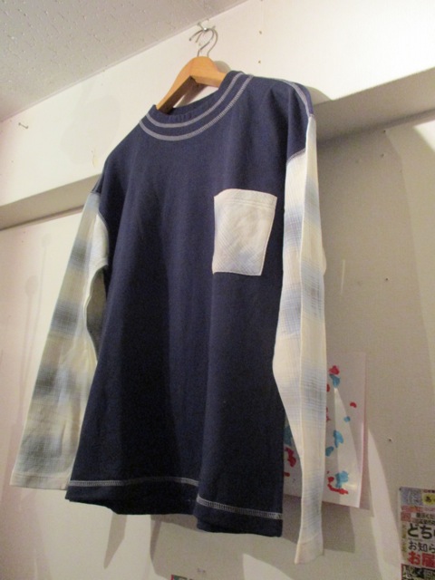 ネイビーボディに、チェック柄の袖と胸ポケットの付いたコンビ使用