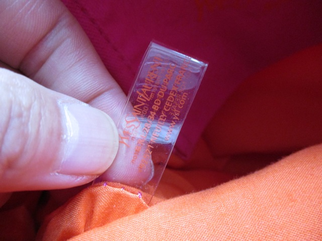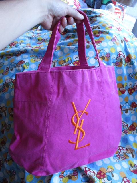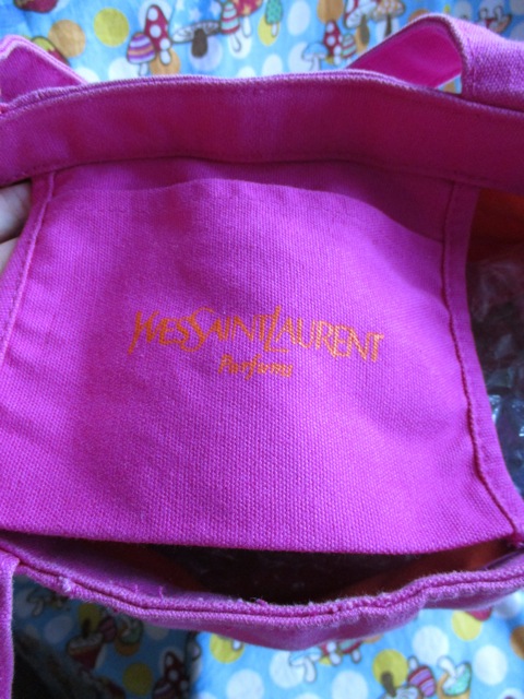 目をひくショッキングピンク地にサンローランのロゴ刺繍がオレンジで入った印象的なミニトート
