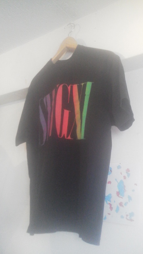 前面は黒ボディにネオンカラーで入ったクールな文字プリント