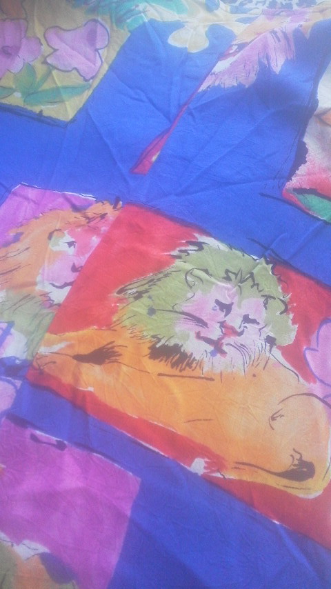 青色ベースにカラフルで華やかな花柄やライオン柄