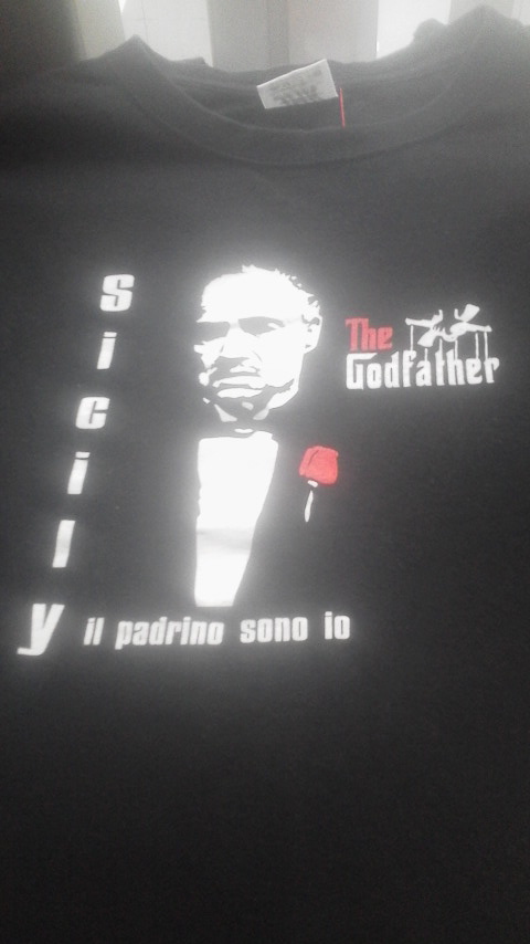 黒ボディにプリントされたロゴとマーロン・ブランド演じるヴィトー・コルレオーネの姿がクールな一枚