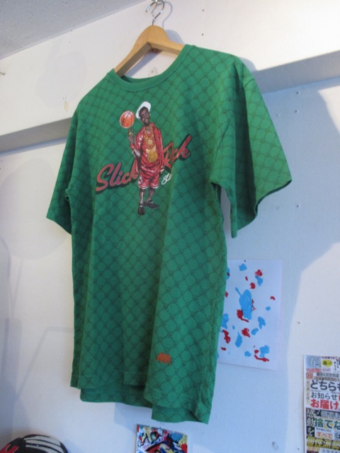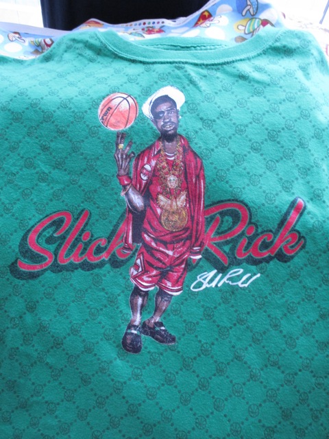 バスケットボール柄を背景にヒップホップアーティストのスリック・リックのイラストがプリントされた、正にな一枚