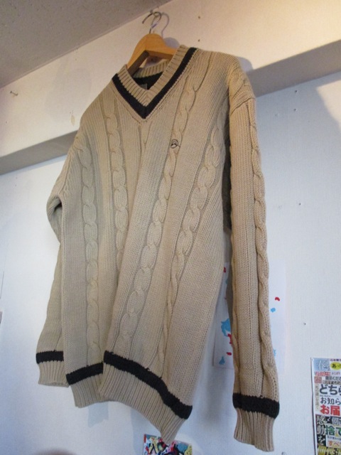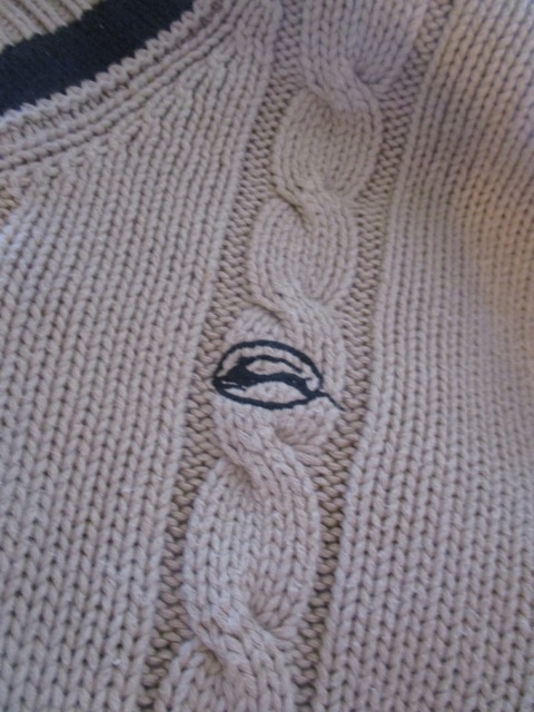 ベージュカラーにネイビーのラインが良い感じのチルデンニット