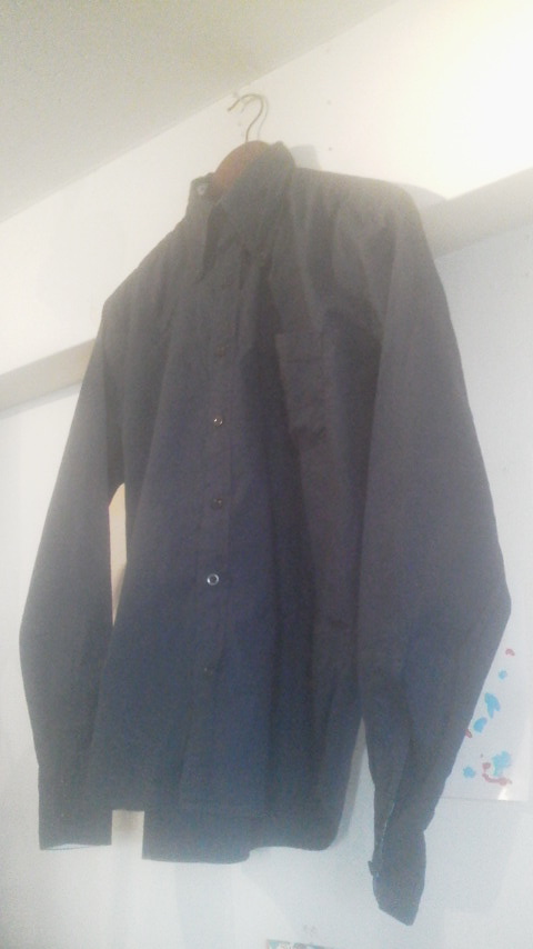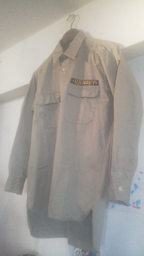 ベージュカラーのワークシャツに US NAVY のワッペンが付いた一枚