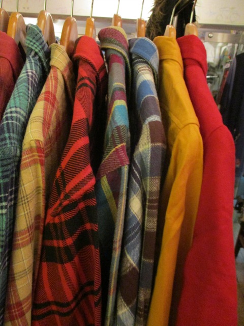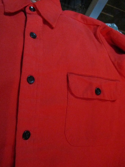 目をひく赤のネル地に黒のボタンが格好良い一枚