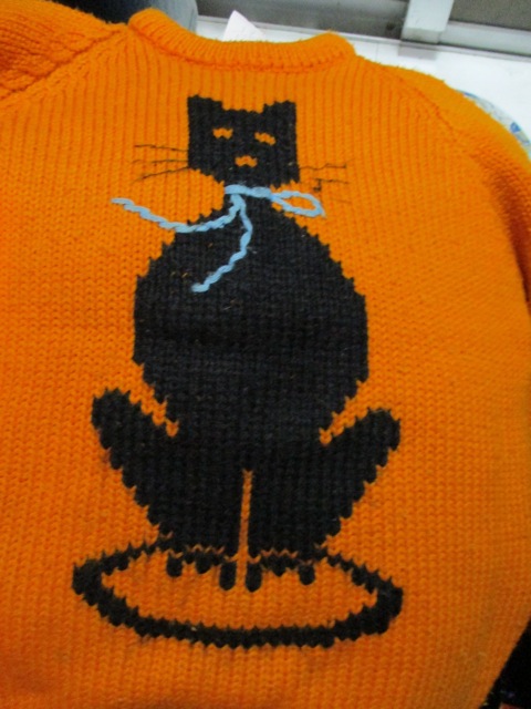 目をひくオレンジカラーに水色のリボンをした黒猫柄
