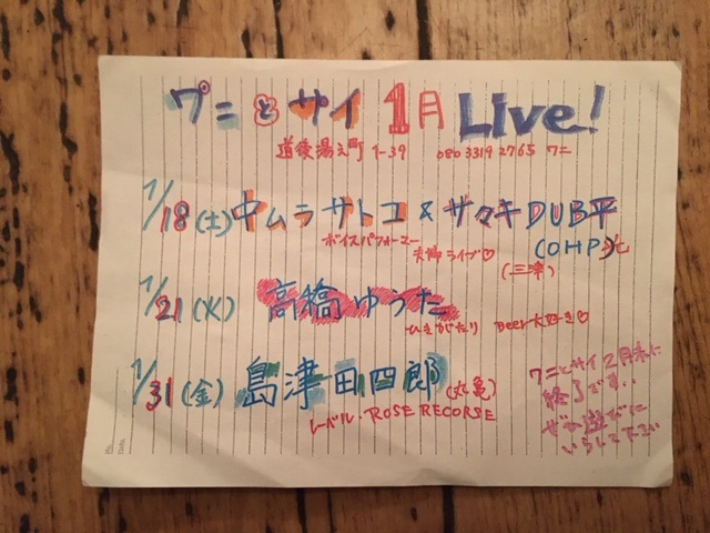 2月でいったん幕を閉じる道後のBAR「ワニとサイ」さんの1月のライブスケジュール