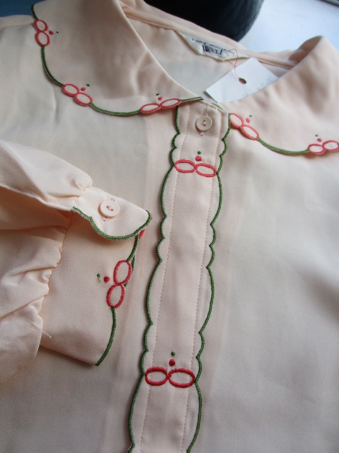 襟や袖、前開きのカッティングと刺繍がユニークで可愛らしい一枚