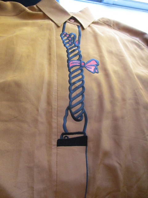 前開き部分に女性の手と男性の手がつなひきしてるユニークな刺繍デザイン