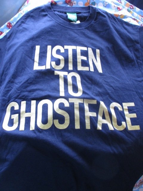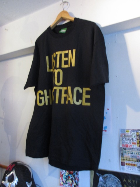 「LISTEN TO GHOSTFACE」(ゴーストフェイスキラーを聞け)とプリントされた一枚