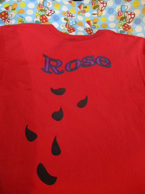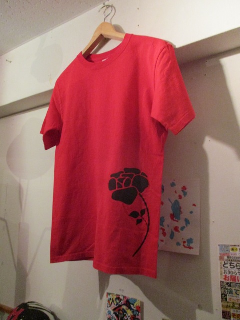 真っ赤なボディの前面左下に黒で入った薔薇のイラストプリント
