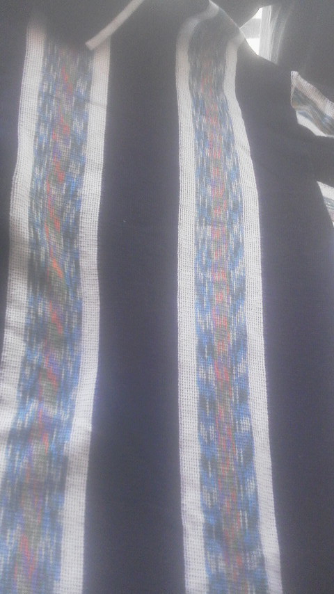 モノクロカラーのストライプにカラフルな配色の織り柄が印象的です